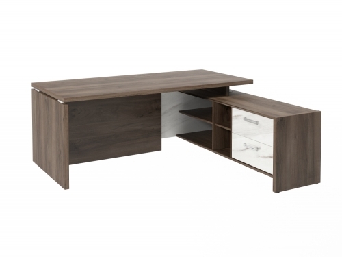 Столешница, бок стола и бок тумбы выполнены из ЛДСП толщиной 38 мм. Цвет - "Орех Пацифик Табак". Кромка 2 мм.